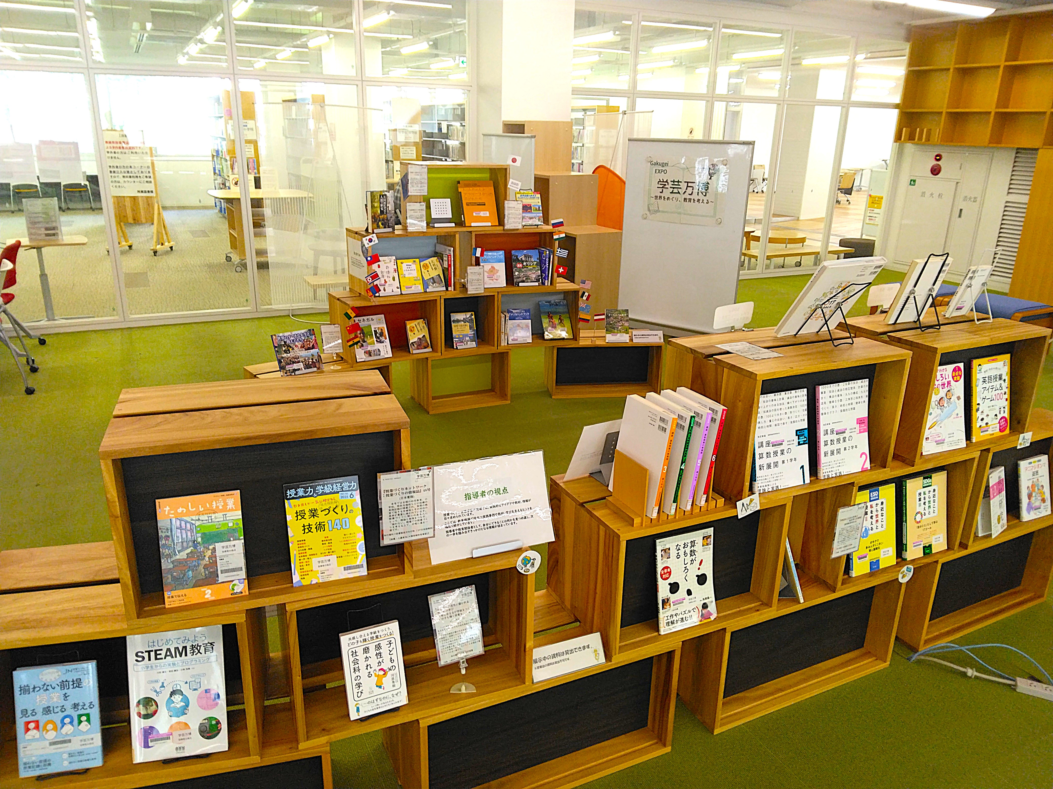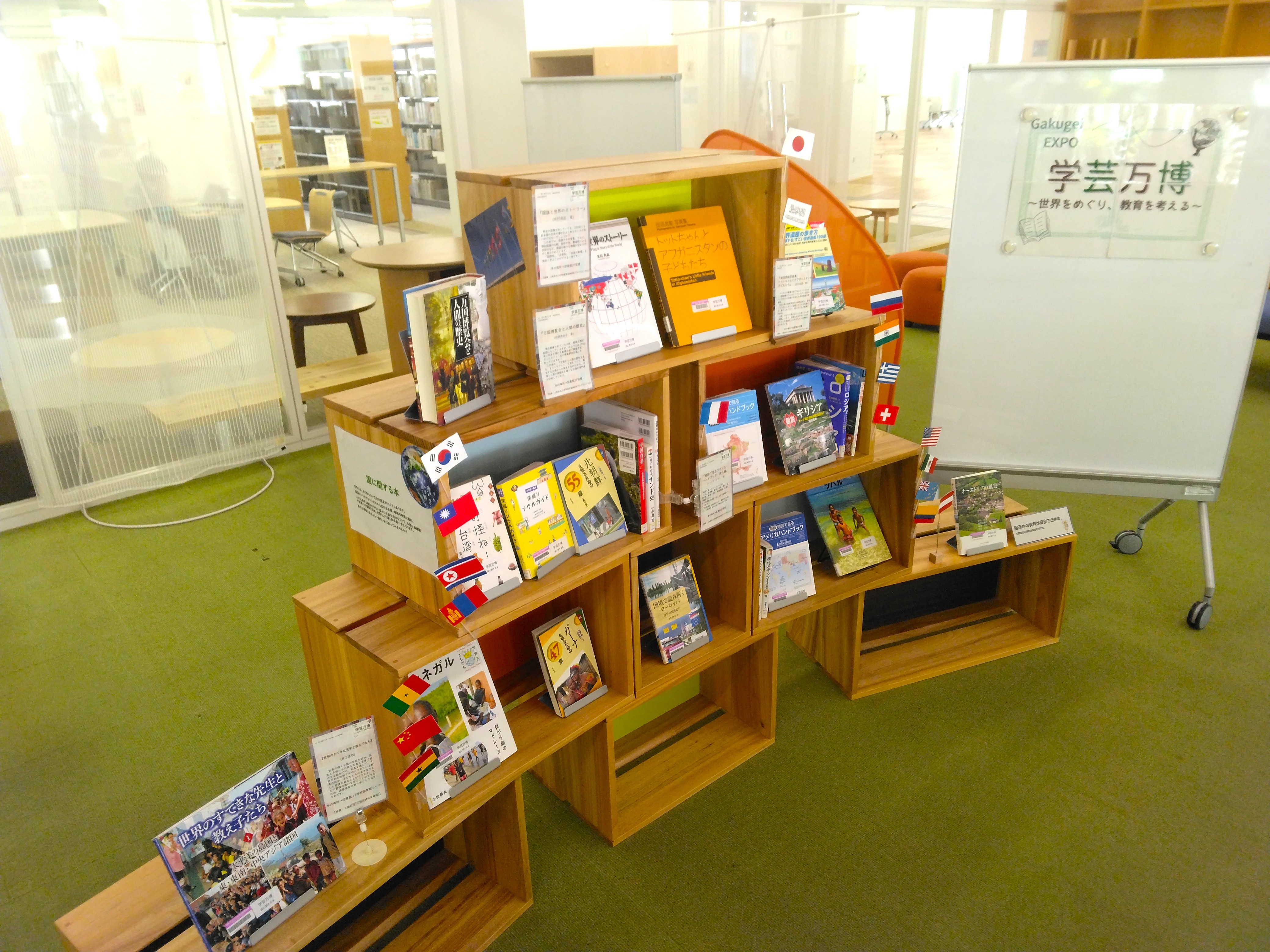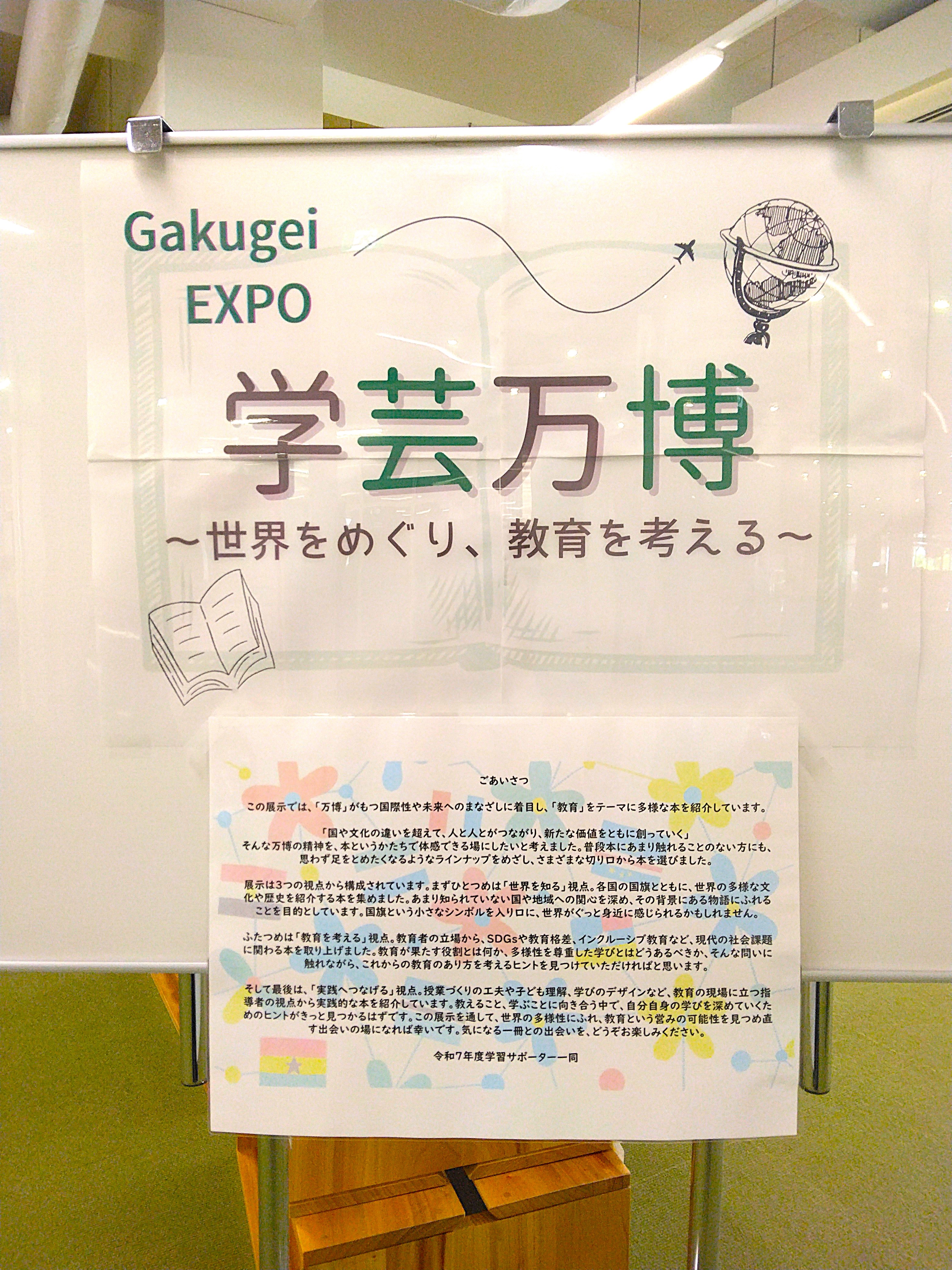 令和7年7月30日~令和8年1月28日の間、学習サポータの企画展示「学芸万博~世界をめぐり、教育を考える~」を図書館1Fラーニングコモンズ内の「つみ木ばこ」で開催しました。