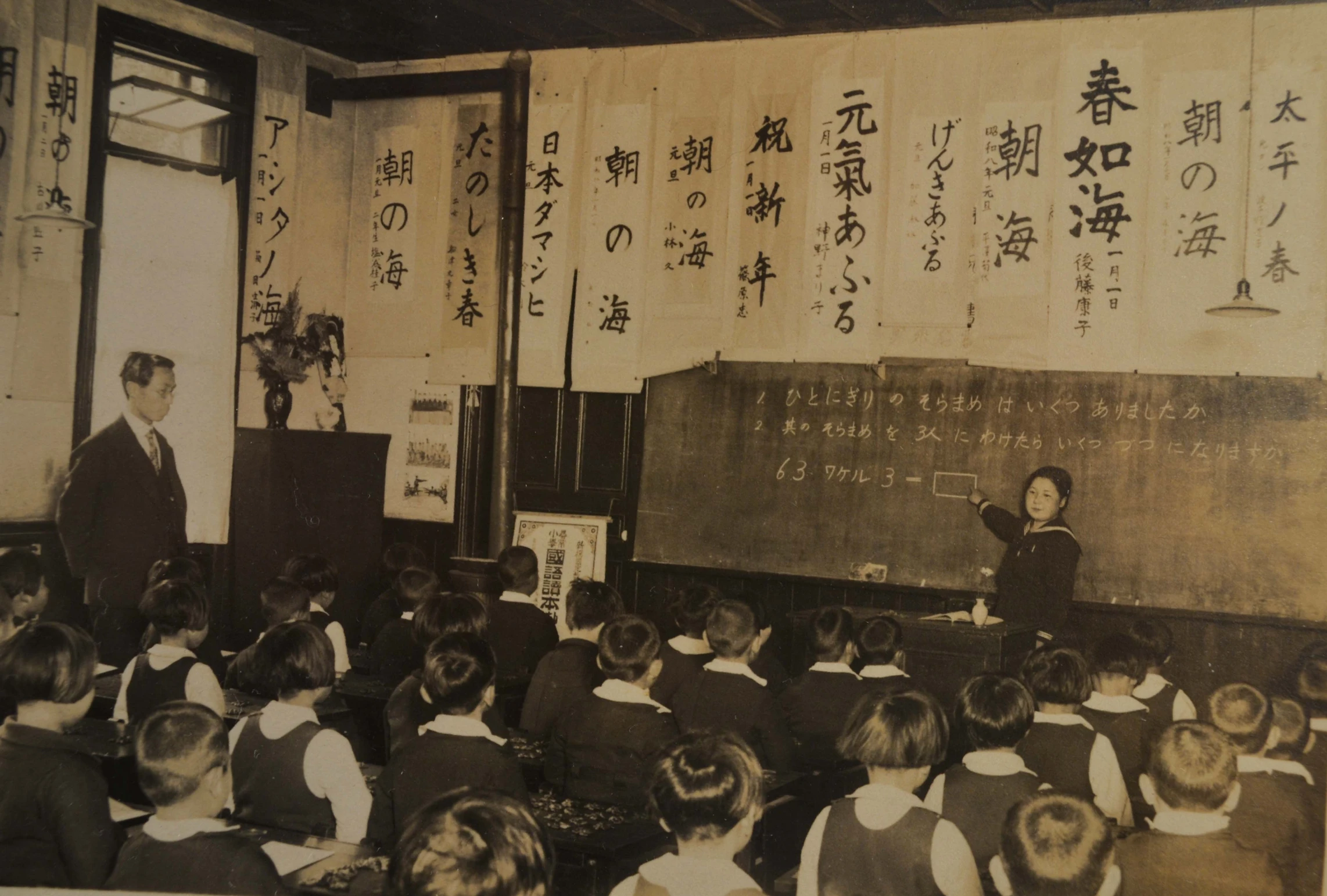 東京府女子師範学校の最終学年生徒による、附属小学校(現在の東京学芸大学附属竹早小学校)での教育実習風景です。一学期間(約3カ月程度)、教育実習が行われました。