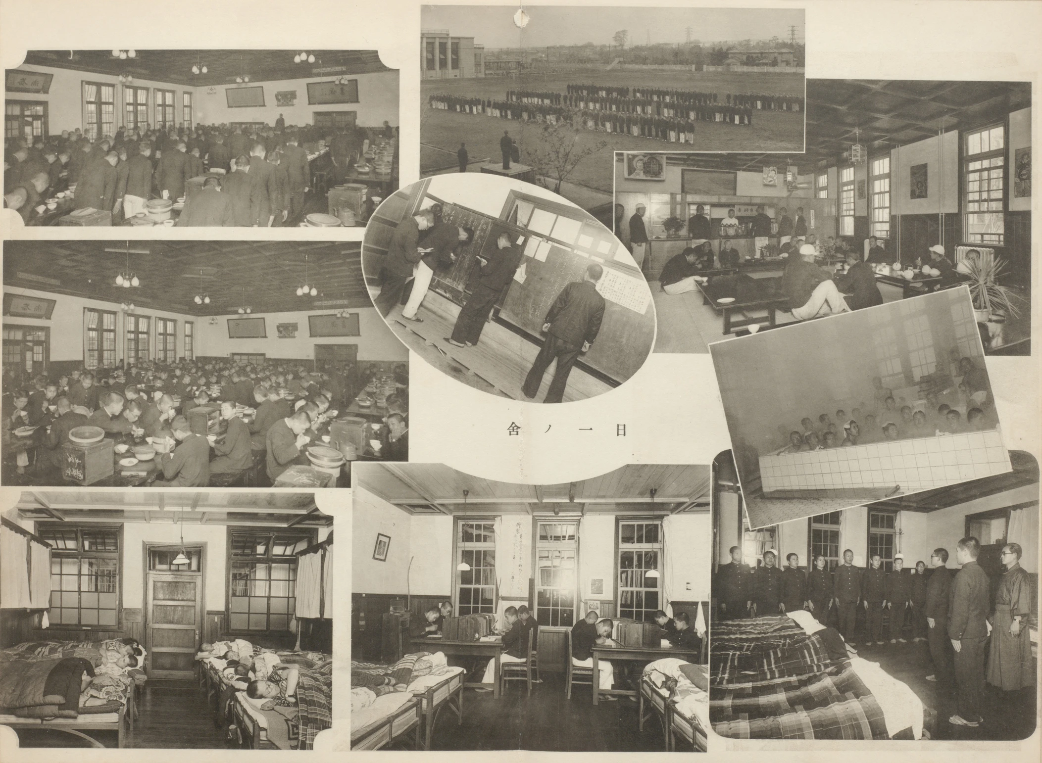一枚目の写真は、青山師範学校の寄宿舎での生活の様子です。この時期は制度的には通学も認められていましたが、多くの生徒が寄宿舎に暮らしていました。師範教育は学校の中で行われただけでなく、寄宿舎生活まで含むものであり、寮生には規律が求められていました。