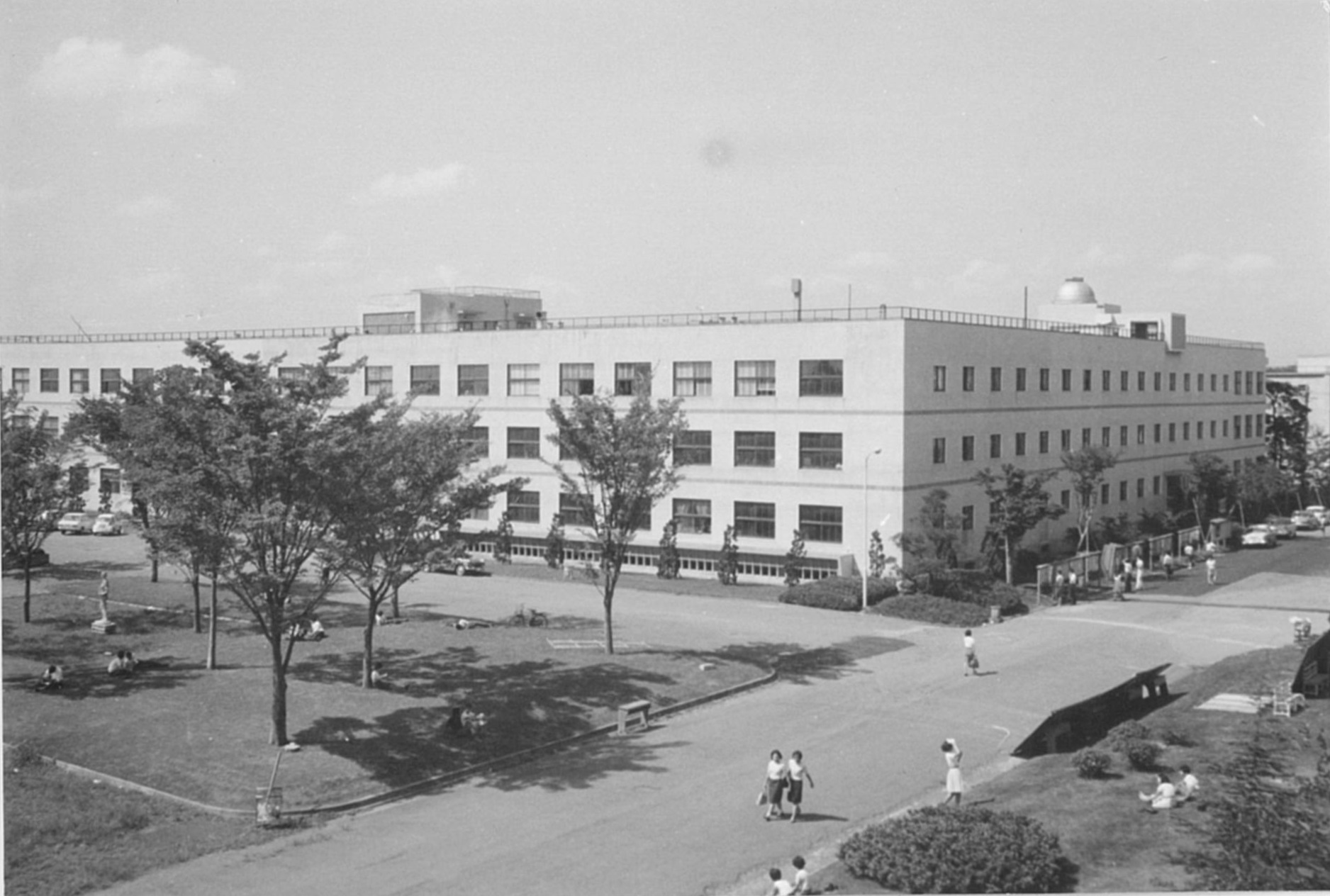 上の写真は、1969年に中央6号館(旧・人文社会2号館)辺りから撮影された写真です。奥の建物は中央1号館(旧・自然科学1号館)です。下の写真は、角度は違いますが同じ方向から撮った現在の写真です。1969年当時は細かったケヤキの木が大きく育っているのがわかります。