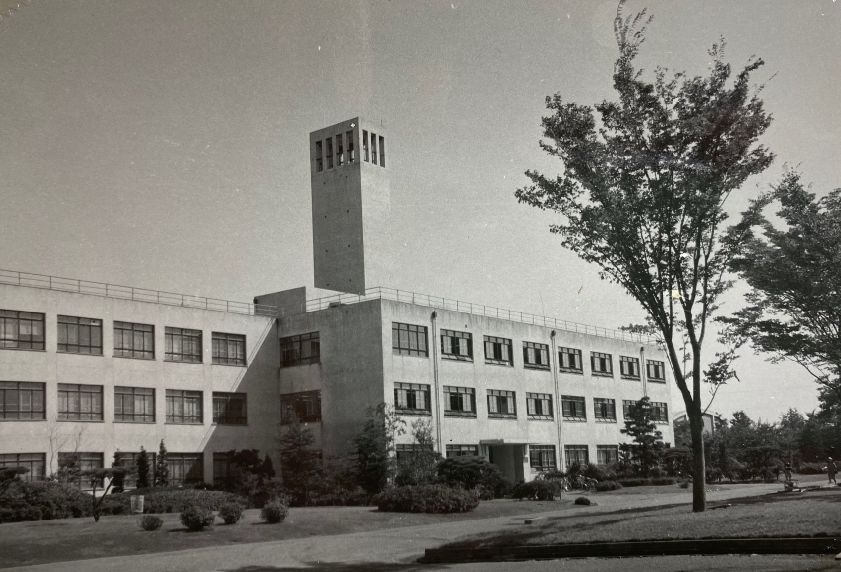 1949(昭和24)年、東京学芸大学の設置と同時に、附属図書館も設置されました。小金井キャンパス内に旧図書館が新築されたのは、1961(昭和36)年のことです。旧図書館は、現在の中央6号館(元・人文社会2号館)にありました。当時の中央6号館の塔にはまだ時計はありません。1964年のキャンパス統合により図書館の分館も統合され、閲覧室を増やすなど、学生が利用しやすい環境が整えられていきました。