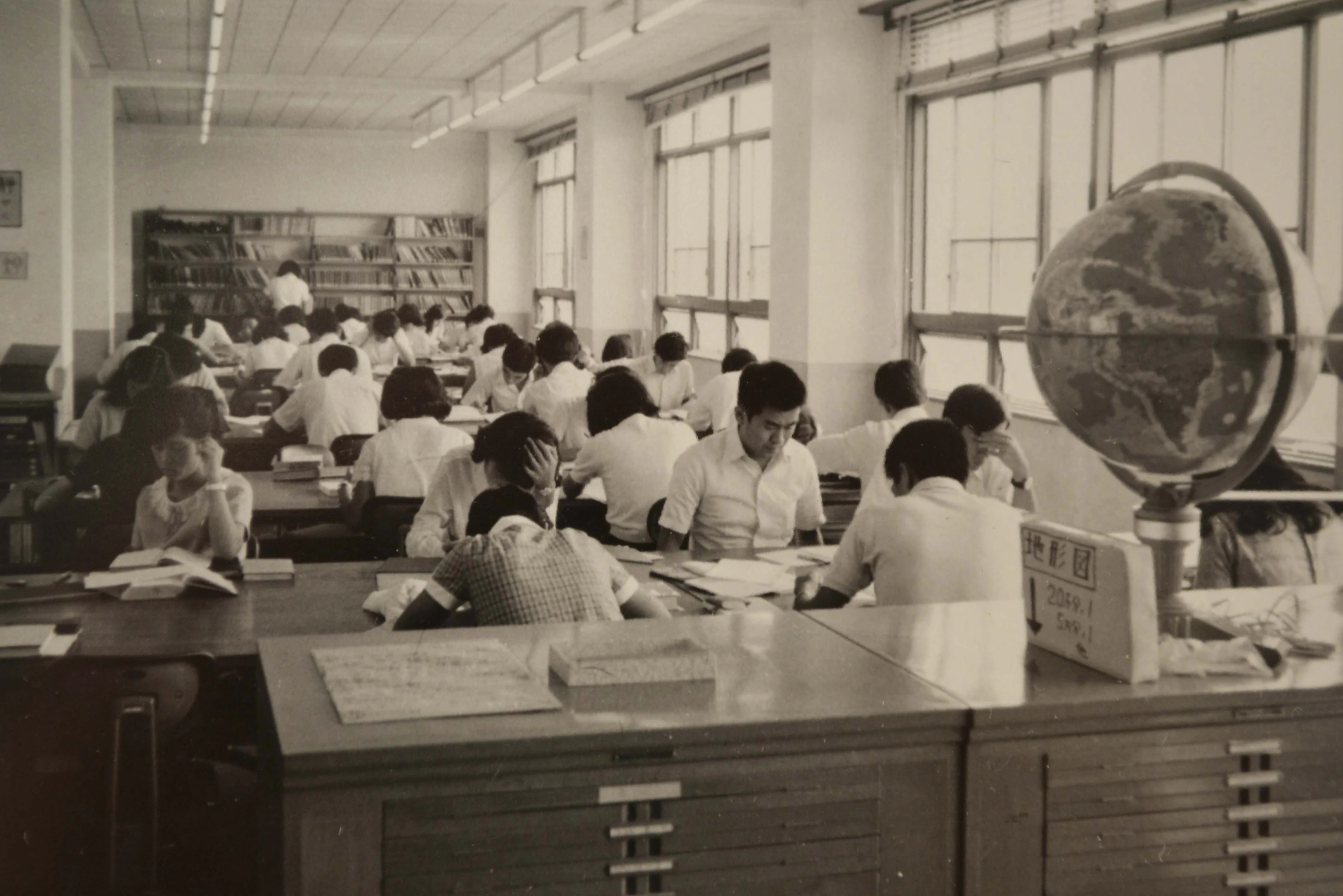 1960年代の図書館閲覧スペースの様子です。多くの学生が勉学に勤しんでいます。