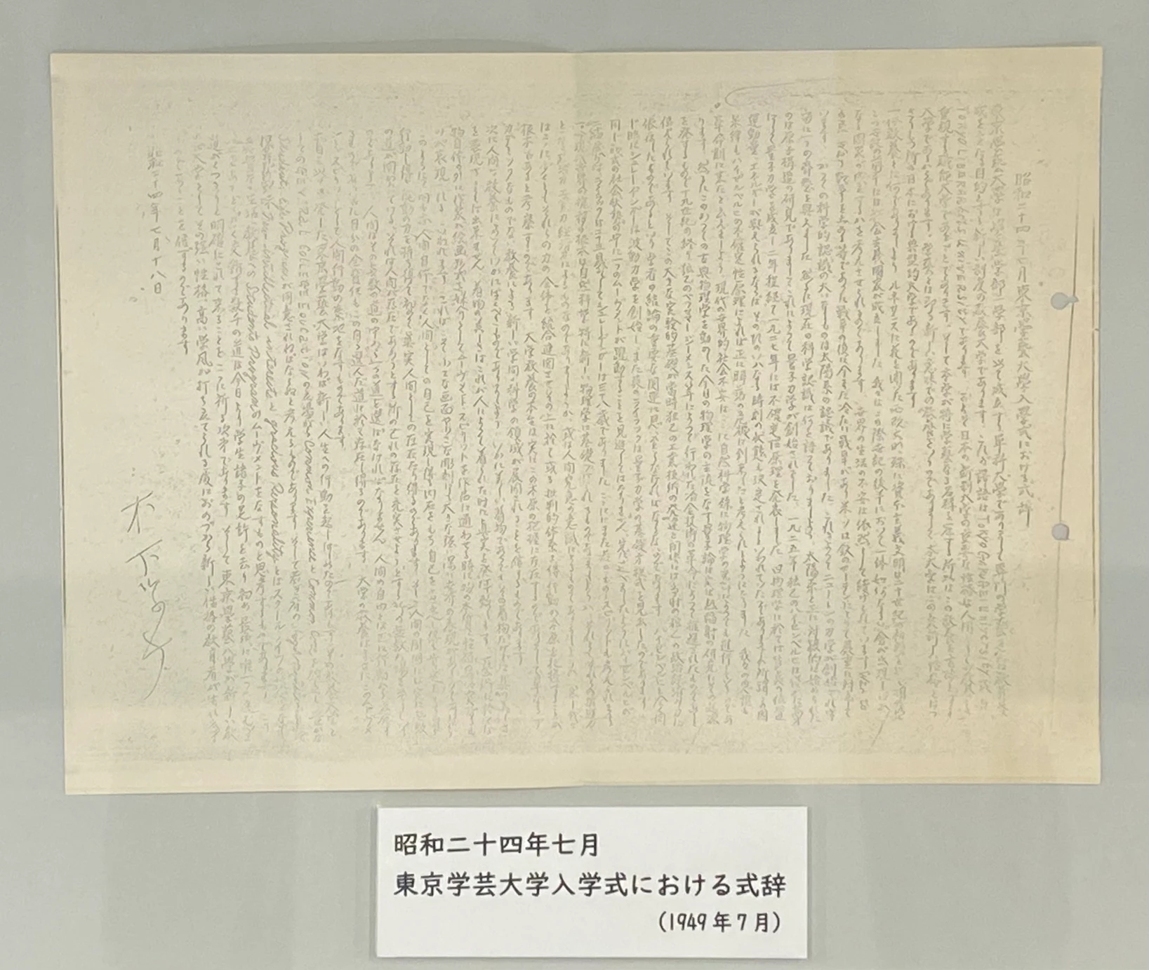 こちらの資料は、木下一雄初代学長の第1回入学式の式辞です。第1回入学式は1949年7月18日に世田谷分校講堂で挙行されました。この式辞において木下学長は、東京学芸大学について「専門の学芸を究め教員養成を主たる目的とする新しい制度の教養大学」であると述べています。