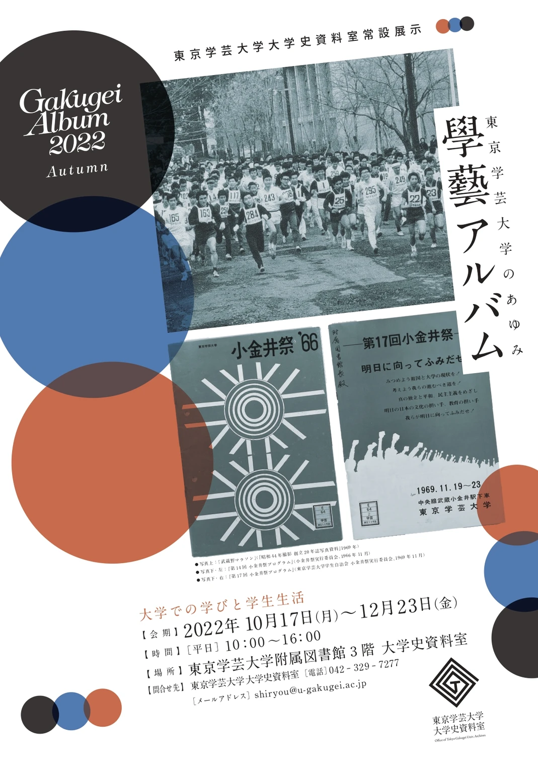 現在、大学史資料室では、常設展示「東京学芸大学のあゆみ」を開催中です。10~12月期は、「大学での学びと学生生活」に焦点を当て、1960~70年代を中心に、大学においてどのような学び・教育が行われ、学生たちはどのような生活を送っていたのか、学生生活や授業、大学行事などの資料や画像から読み解いています。