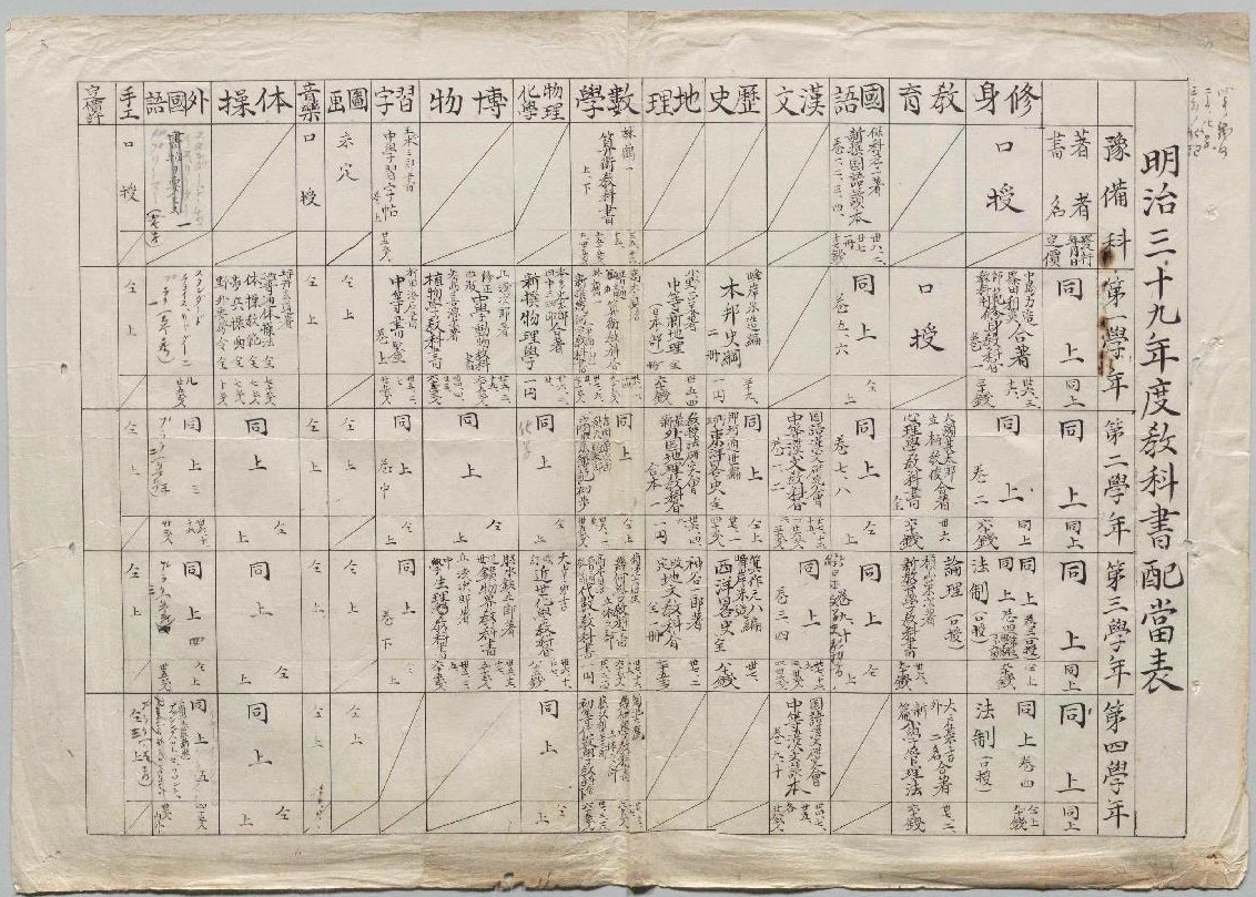 「明治三十九年度教科書配当表」『覚(雑)東京府師範学校』(1904~1907年)大学史資料室所蔵