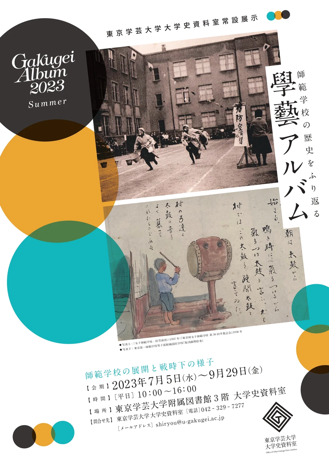 現在、大学史資料室では、常設展示「師範学校の歴史をふり返る」を開催中です。今回は「師範学校の展開と戦時下の様子」と題し、1930年代後半以降の時期を中心に、戦時下における師範学校および師範学校付属小学校(国民学校)の活動や生活について、当時の写真や資料から紐解いています。