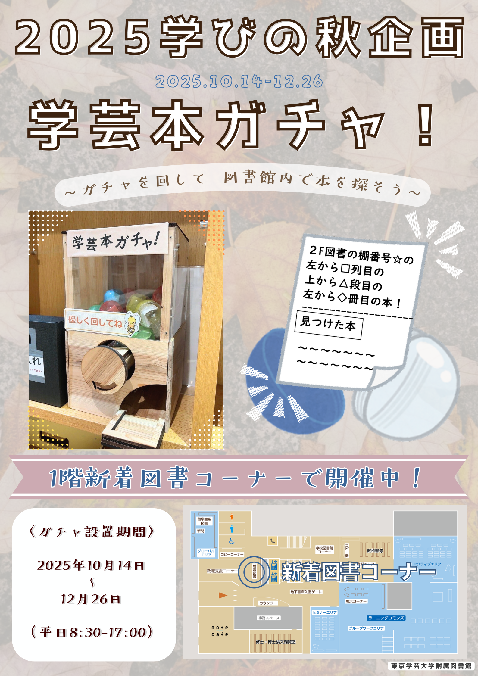 2025年10月14日から12月26日に2025学びの秋企画「学芸本ガチャ!~読書の世界を広げよう!~」を開催しました。